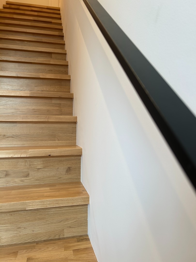 Via een aparte inkomhal gaat u richting de eerste verdieping. De hal biedt toegang tot een gastentoilet met lavabo en de lichtrijke woon- en eetkamer.